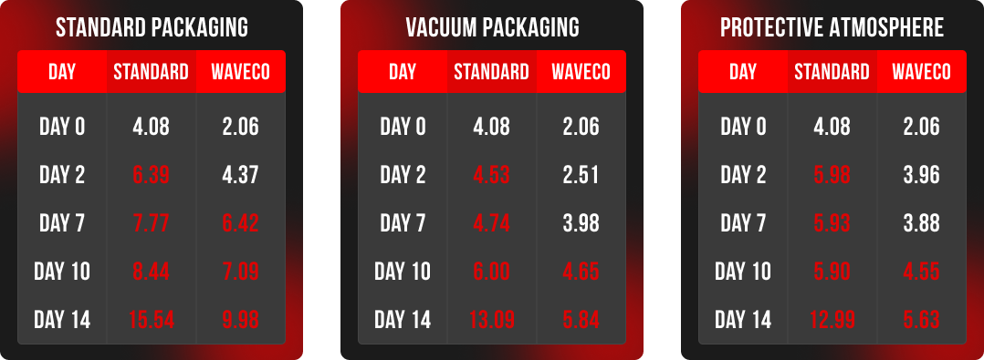 The aspect of increasing the shelf life of foods has been demonstrated through a microbiological analysis and the Total Mesophilic Count (CBT) which clearly confirms the decontamination effect with induced maturation® of a variety of raw beef cuts and ground beef.